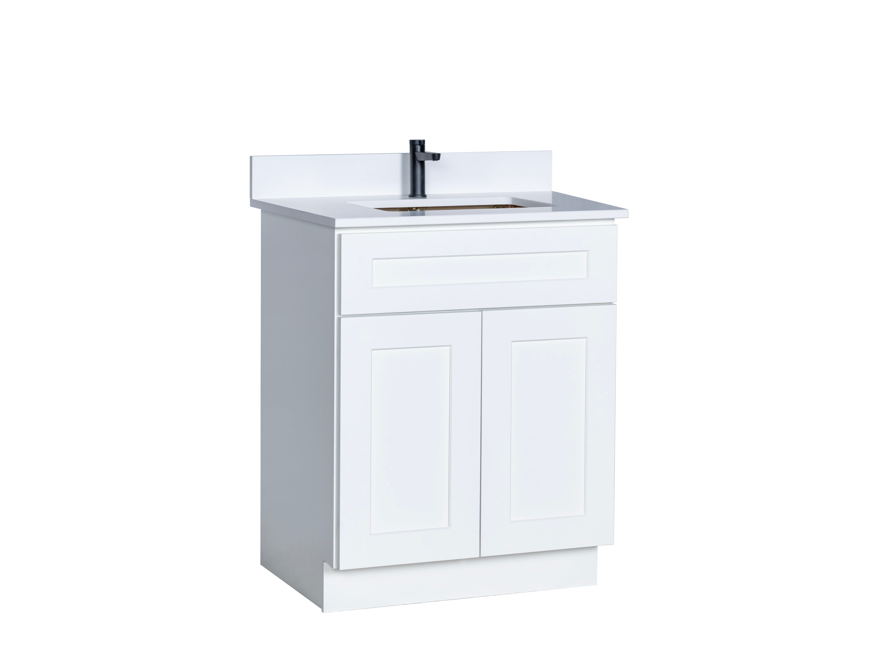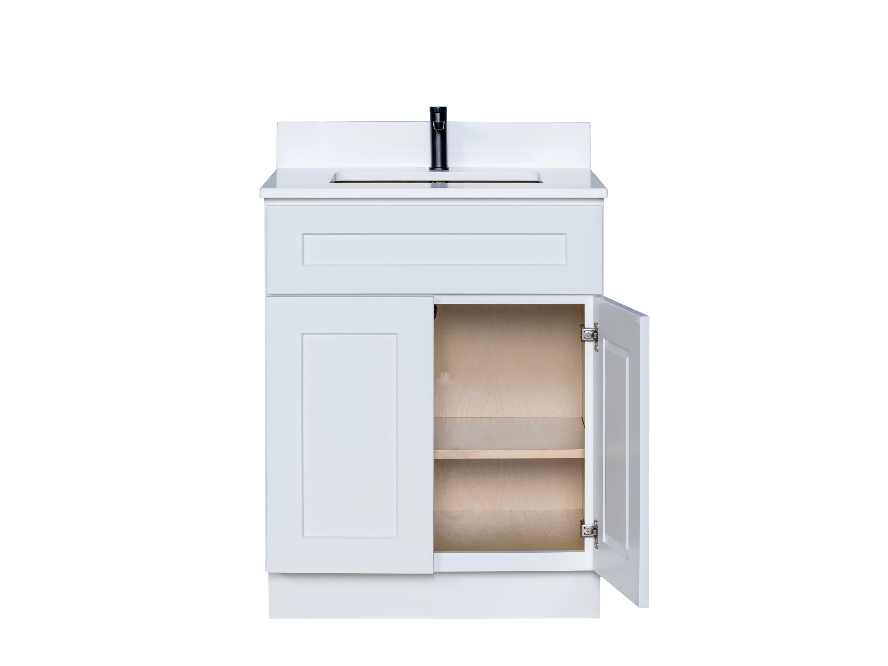 All wood pre-assembled cabinet in white with quartz countertop. This 27-inch vanity offers ample under the sink storage space. Dummy drawer under the sink is pre-installed with a tip-out tray for additional storage space.